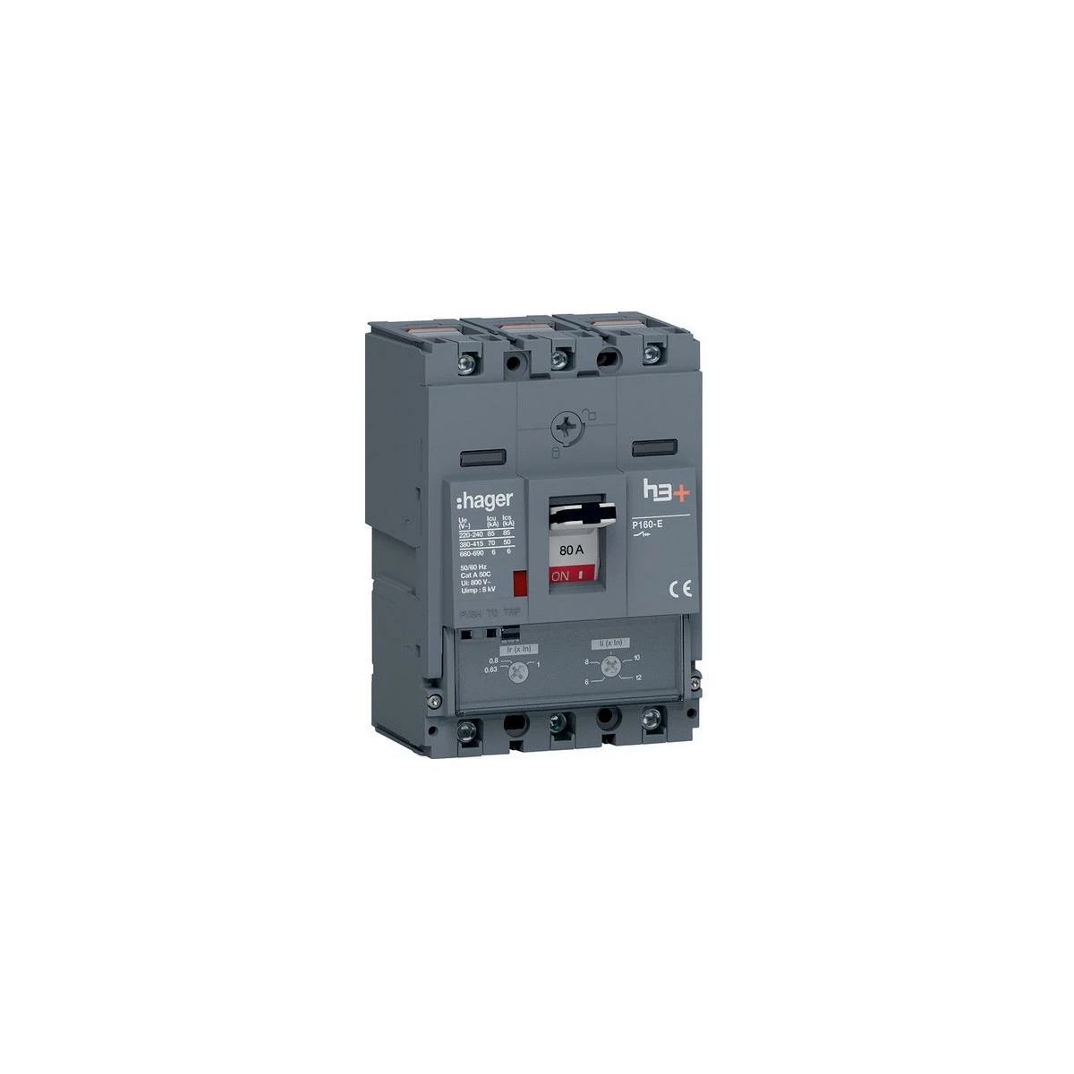 Leistungsschalter h3+ P160 TM ADJ 3P3D 80A 70kA CTC. Der Kompaktleistungsschalter in Übereinstimmung mit DIN EN 60947-2 schützt die elektrische Anlage und Netze vor Überlast und Kurzschluss. Dafür lassen sich der thermische Auslöser für den Überlaststrom (Ir) und der magnetische Auslöser für den unverzögerten Kurzschlusstrom (Ii) getrennt voneinander einstellen. An der Stellung des Knebels sind die drei unterschiedlichen Betriebszustände erkennbar (EIN = oben, AUS = unten, ausgelöst = Mittelstellung). Eine Vorrichtung zum Verriegeln des Schaltzustandes in EIN- oder AUS-Position ist integriert und kann mit einem handelsüblichen Vorhängeschloss ohne zusätzliches Zubehör genutzt werden. Über eine Auslösetaste kann der Auslösemechanismus getestet und die Hauptkontakte geöffnet werden. Ein Klappdeckel mit unverlierbarer Schnellschraube ermöglicht den Zugang zu dem Installationsraum für optionale Hilfskontakte und andere Auslöser. Integriertes Zubehör ist über Sichtfenster ohne öffnen des Klappdeckels erkenn- und identifizierbar.