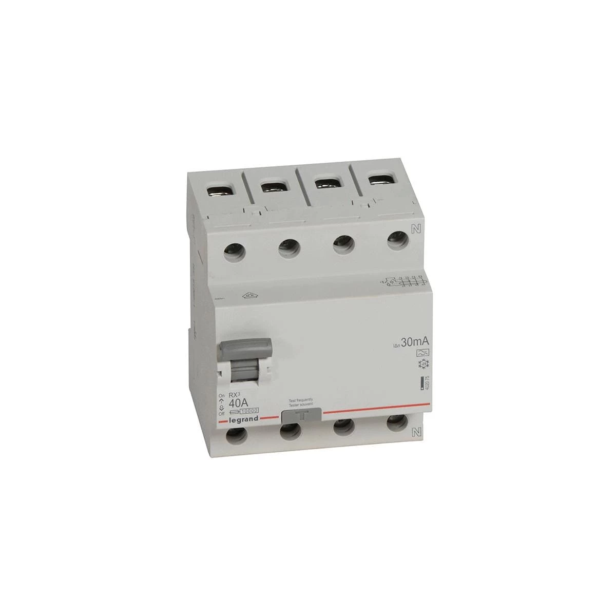 Legrand Fehlerstromschutzschalter RX3, Typ A, für Wechsel- und pulsierende Gleichfehlerströme nach VDE 0664-10, EN 61008-1, unverzögert, 4-polig, Bemessungsstrom In 40 A, Bemessungsfehlerstrom Idn 30 mA, Bemessungsspannung Un 400 VAC, Bemessungsfrequenz 50 Hz, Stoßstromfest bis 250 A, Bemessungskurzschlussstrom 10 kA bei geeigneter Vorsicherung, Befestigung auf Hutprofilschiene EN 60715 durch rastende Schnellbefestigungen, klare Information vorne auf jedem Gerät, mit Untersteckschutz zum sicheren Einführen des Leiters in Fahrstuhlklemme.